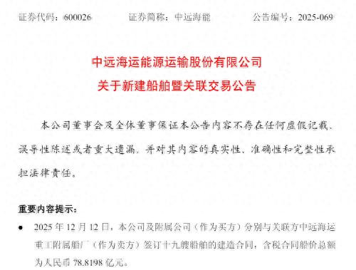 12月12日晚间,中远海运能源运输股份有限公司宣布,与关联方中远海运重工附属船厂签订19艘船舶建造合同,含税合同船价总额为人民币78.8198亿元,连同建造期利息、监造费等资本化费用的总投资约为81.24亿元。